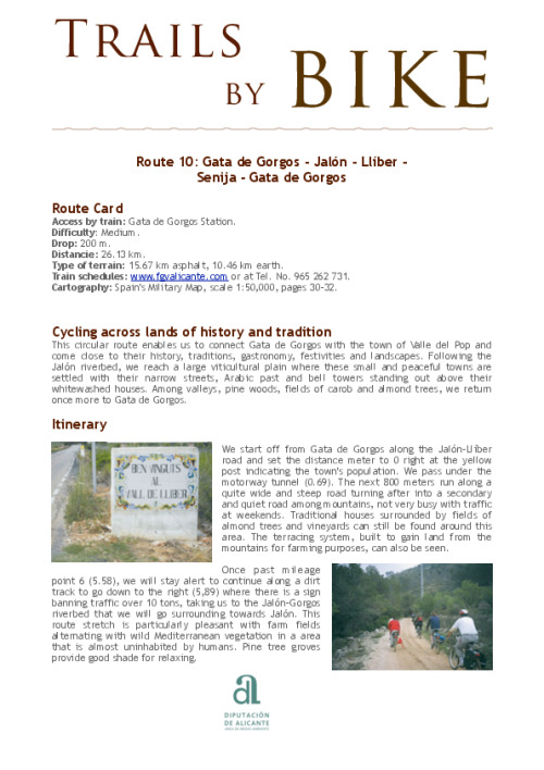 This circular route enables us to connect Gata de Gorgos with the town of Valle del Pop and come close to their history, traditions, gastronomy, festivities and landscapes. Following the Jalón riverbed, we reach a large viticultural plain where these small and peaceful towns are settled with their narrow streets, Arabic past and bell towers standing out above their whitewashed houses. Among valleys, pine woods, fields of carob and almond trees, we return once more to Gata de Gorgos.