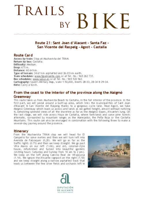 This route takes us from Muchavista Beach to Castalla, in the full interior of the province. In the first part, we will pedal around a built-up area, which links the municipalities of Sant Joan d'Alacant & San Vicente del Raspeig thanks to a gorgeous cycle lane. Near Agost, we take Maigmó Greenway which leads us across arid lands as we gather height, almost without noticing it, beholding splendid views of all the shoreline as far as the Maigmó slopes, Alicante's lung. On the last stage, we will ride across Hoya de Castalla, where farmlands and some pine forests alternate, surrounded by mountain ranges as the Manejador, the Peña Roja or the Castalla Mountains. This route can also be envisaged in combination with the following three to make a several-day journey around the province.