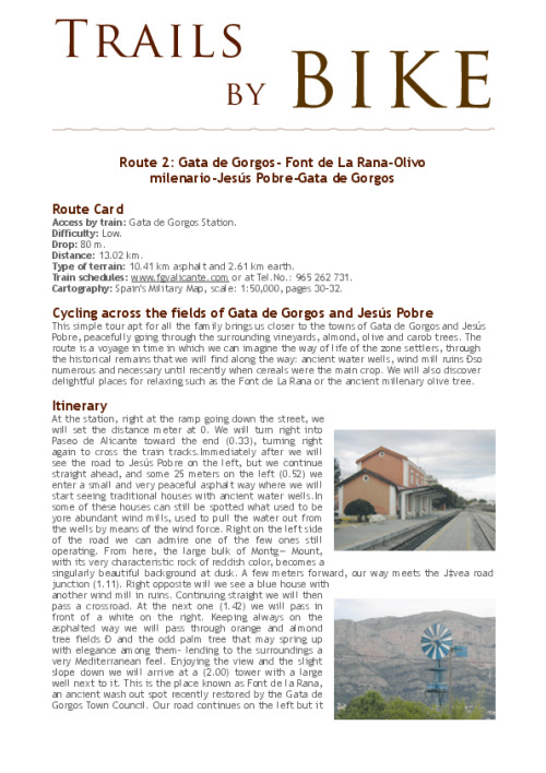 This simple tour apt for all the family brings us closer to the towns of Gata de Gorgos and Jesœs Pobre, peacefully going through the surrounding vineyards, almond, olive and carob trees. The route is a voyage in time in which we can imagine the way of life of the zone settlers, through the historical remains that we will find along the way: ancient water wells, wind mill ruins Ðso numerous and necessary until recently when cereals were the main crop. We will also discover delightful places for relaxing such as the Font de La Rana or the ancient millenary olive tree.