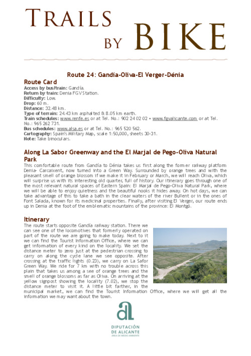 This comfortable route from Gandía to Dénia takes us first along the former railway platform Denia- Carcaixent, now turned into a Green Way. Surrounded by orange trees and with the pleasant smell of orange blossom if we make it in February or March, we will reach Oliva, which will surprise us with its interesting old quarter, full of history. Our itinerary goes through one of the most relevant natural spaces of Eastern Spain: El Marjal de Pego-Oliva Natural Park, where we will be able to enjoy quietness and the beautiful nooks it hides away. On hot days, we can take advantage of this to take a bath in the clear waters of the river Bullent or in the ones of Font Salada, known for its medicinal properties. Finally, after visiting El Verger, our route ends up in Denia at the foot of the emblematic mountains of the province: El Montgó.