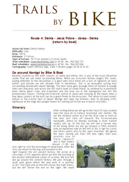 Recently marked by the town councils of Jávea and Dénia, this is one of the most attractive routes that we can make surrounding Dénia. While our excursion follows largely this route, paying attention to the description is a good idea since there are a lack of signposts at some points, and besides we will deviate from it sometimes. This is an enjoyable cycling tour surrounding emblematic Mount Montgó. The bike route goes through fields of almond & orange trees and vineyards, and across the still idyllic town of Jesœs Pobre, to continue by a prelittoral plain where green crops and mountains and the blue sea in the background are still the predominant colours. Visiting the historical centre of Jávea and relaxing at the beach after a few tapas (snacks) at the port can be a grand finale to the excursion. The return by boat unveils before us the marine face of Mount Montgó and Cape San Antonio, with its amazing cliffs, lighthouse at the edge and upright towers for looking out to the sea in search of pirates.