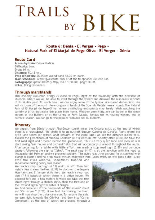 We find ourselves at the crossroads of "Almassara" street and "Carrer Mol’" (8.28). If we feel like touring the town, we will now stop the distance meter. To resume the ride, we turn right towards the City Hall and then into "Carrer Cervantes", at the end of which we proceed through a motorway leaving El Verger. We arrive at national motorway 332 (9.20) and opposite, on the right, we will see the cycle lane that we will take towards Pego. This cycle lane is one of the best in all Marina Alta, well marked and aside from motorized traffic. We will cross through the most suitable place and continue on the lane. If we look closely, (9.68) we will see on our right a small monument, somewhat poor aesthetically, but of important geographic significance as it represents the Greenwich meridian, that is, 0 meridian. The cycle lane moves away from the bridge and leads us to pass under the new ring road (10.45). After a few kilometres the cycle lane ends at the Pego entrance (20.21). We continue, and on arriving at the two last roundabouts we see the Tourist Office on our right (20.81) where we can be extensively briefed about all there is to see in town. If our wish is to visit it, we stop the distance meter at this point. To resume the route, we reconnect the meter here and go out again on the cycle lane. We turn left and follow the sign to "Marens" (22.53). We ride know on a plain filled with orchard and lemon trees. At the next stop road sign (23.97) we proceed anew straight. We reach another stop (24.65) and we follow the sign to "Les Marines" right. On the next 300 meters we will be extremely cautious, as this short stretch can be busy with traffic. We turn left (24.86) on "Cam’ de els Marjals" and continue once more among orchards through this quiet road. At the end we reach a stop road sign (26.38) and turn right. Soon we will come across the Bullent river on our left, whose enchanting scenes will soon amaze us. On the Saturday before the carnival, a popular, fun competition is held here where participants, dressed in costumes and aboard makeshift boats, compete among one another to arrive "safe and sound" at the finish. At the end of this road we see an asphalted way going up, but we continue left through the dirt track (26.22). We enter here one of the most rugged and better preserved areas of the park. However, (stop the distance meter) we recommend making an effort and take the road up to Monta–eta Verde to admire from atop the magnificent views of the zone. Further on (27.57) we see a most suitable spot on our left for bathing in warm days. We continue and arrive to an esplanade with abundant reedbeds and the remains of a metallic structure, perhaps an old car parking lot (27.79). On that direction right we find one of the best places for bathing. This is the "ullal" or pond of "El Salinar", a water spring where people usually bathe during summer. From July to September, the Pego town hall usually makes available free of charge a number of rafts here for sailing through the marshlands. We proceed left among reedbeds. Shortly after, the river appears on our left and we continue always parallel to it to arrive at a narrow footbridge with green floodgates that we cross. (28.87). Next we pass through a similarly narrow alley between two gardens. We continue right through a dirt track and about 300 meters further we arrive at another attraction of the zone: "Font Salada" (29.25). Somewhat salty water flows from this very popular spring among the people of Pego and Oliva, and hence its name. Its waters keep the same temperature throughout the year. As it is believed to have skin-healing powers, people carrying water away or bathing in it is a common scene. Recently a small bar has been opened here to quench our thirst.